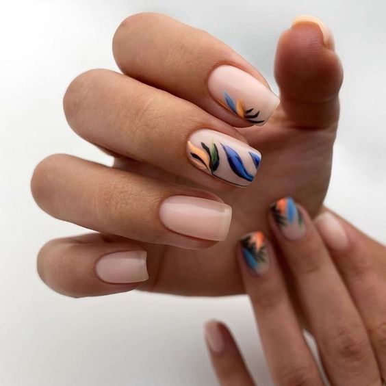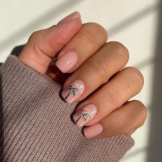 Invoke the feeling of warm, sandy beaches under your fingertips with this speckled nail design. The neutral base speckled with black dots gives a nod to the sandy shores, while the occasional nail with a sunset-hued swoosh adds a dash of colors and encapsulates the designs simple yet fun ethos of summer. It’s an ideal match for the simple and short nail preference, offering a vacation simple gel short look.