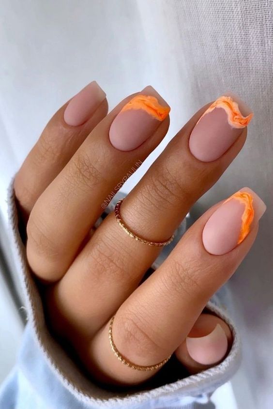 Last but not least, embrace the soft touch of pink with these matte nails adorned with a wavy splash of peachy orange. It’s a simple, almond-shaped marvel that brings to mind the gentle lapping of waves on a sandy beach. These nails are perfect for those seeking a designs simple yet aesthetic addition to their summer beach nails 2024 collection.