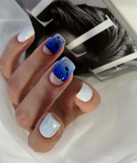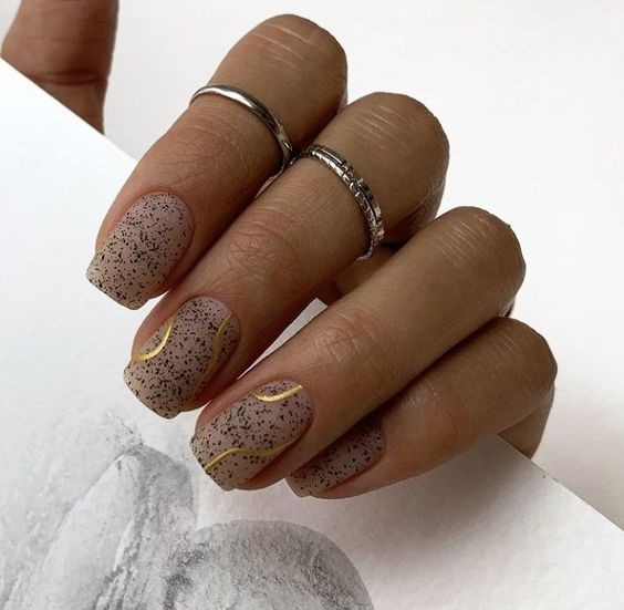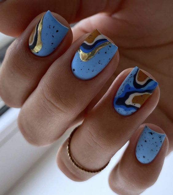 This nail design is a masterpiece of oceanic artistry, with a soft blue base accented by swirling patterns of darker blue and gold. The splatter of black specks gives an impression of the sandy ocean floor or a starry night sky. It’s an exquisite representation of designs sea, as if each nail is a unique wave cresting and breaking with golden sunlight sparkling off the tips.