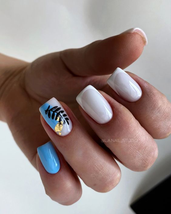 Embrace the nautical vibe with this design that pairs a bright blue accent nail with a clean white base. The addition of a single golden leaf on the accent nail brings a touch of aesthetic sophistication, making it a chic option for vacation simple almond enthusiasts. It’s cute, simple, and perfectly suited for a day sailing or a seaside brunch.