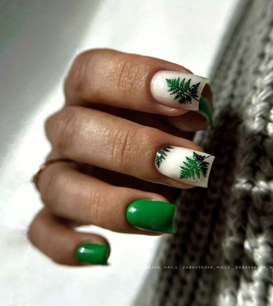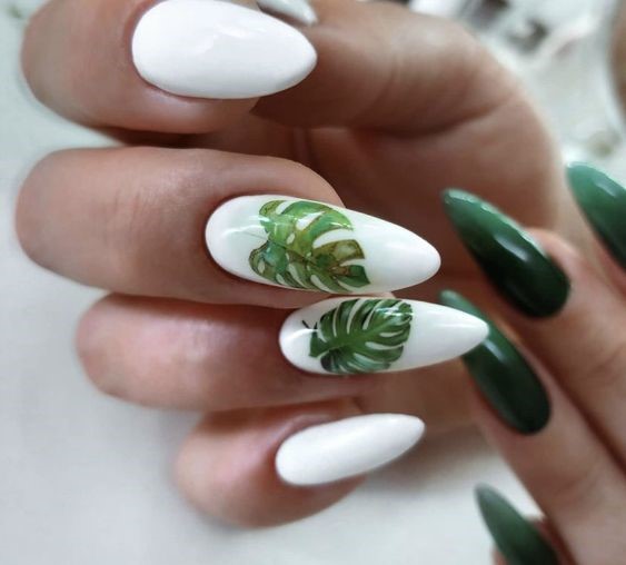 Finally, for the nature lovers and tropical adventurers, these white nails with hand-painted green foliage are a fresh breath of the rainforest. The design is a beautiful blend of designs hawaii and vacation simple gel, and the almond shape is right on-trend for 2024 almond fashionistas. This style is perfect for those who carry the spirit of the jungle even when walking on the beach.