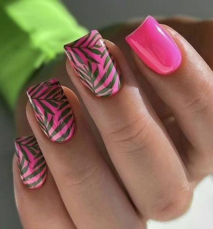 Dive into the wild side with this nail art, where a neon pink nail stands out against a canvas of tropical leaf patterns. This design is unapologetically fun and bright, perfect for those who love a vacation ocean pink statement.