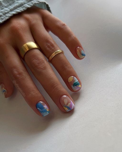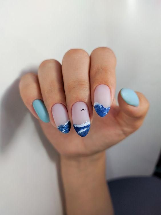 The mystery of a tropical twilight sky is reflected in these stunning nails, with abstract brushstrokes of blue, pink, and yellow. They embody the fun spirit of summer and are a bold inspo almond choice for anyone looking to make a statement. These are the nails of choice for a vibrant vacation ocean pink getaway.