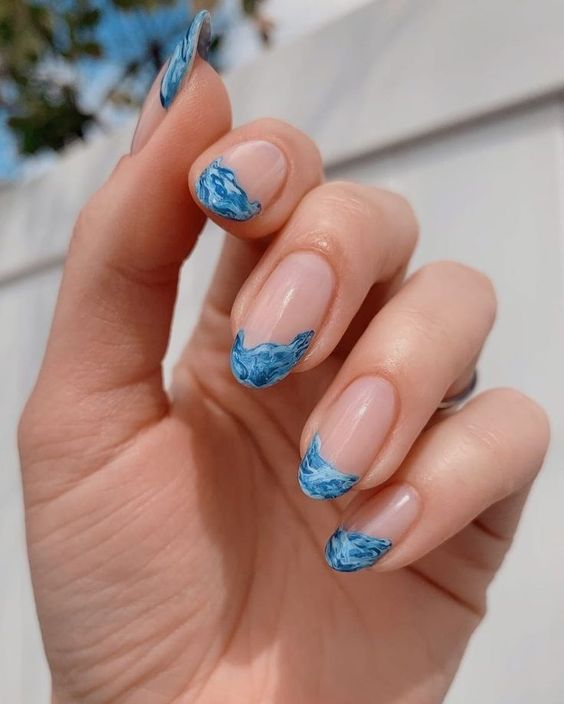 These nails are like ocean waves frozen in time, with swirling blue accents on a transparent base, evoking the movement of the sea. It’s a unique take on designs vacations short, ideal for an abstract aesthetic look.