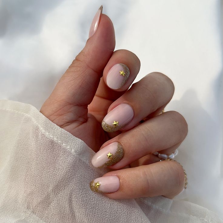 Imagine the golden sparkle of the sand under a star-lit sky transformed into a nail design. This vacation simple gel creation features a nude base with tips dipped in gold glitter, reminiscent of sandy shores. The addition of small, star-shaped appliqués gives a nod to those fun nights by the beach fire, making it a quintessential vacation simple almond choice for summer evenings.