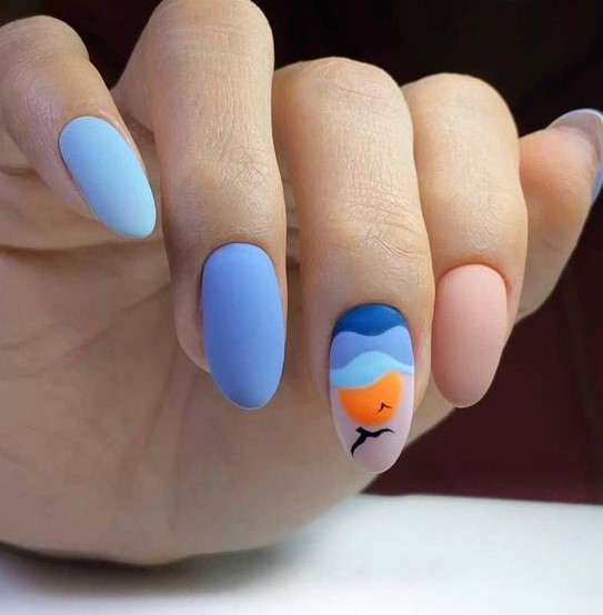 Capturing the serene moments of a beach sunset, these nails showcase a smooth blend of orange, blue, and white, with a silhouetted seagull completing the scene. It’s the essence of vacation ocean pink captured on your nails, reflecting the colors of a peaceful evening by the sea.