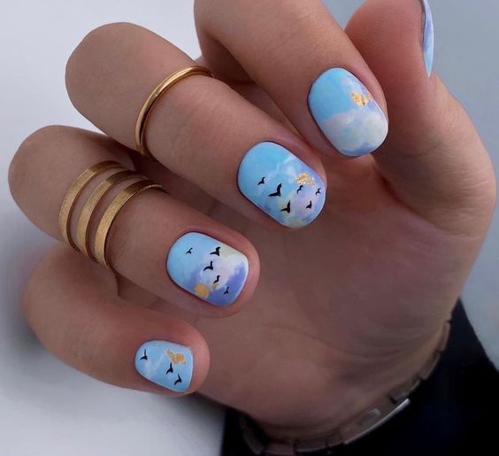 This design with its blue sky background and golden clouds is a homage to the vastness above us, sprinkled with the flight of birds. It’s a cute and aesthetic choice that brings a piece of the sky to your summer beach nails 2024 collection.