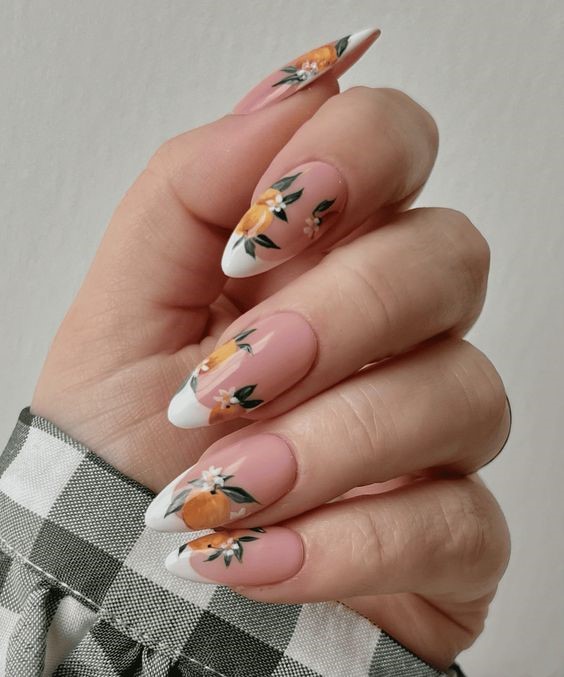 Summer is not just about the blues and greens; it’s also about the vibrant, zesty hues of bright citrus fruits. These nails boast a juicy array of orange and white floral patterns that scream vacation ocean pink, providing a bold contrast against the soft pink background. It’s a designs hawaii inspiration that’s as refreshing as a cold glass of lemonade on a hot day.