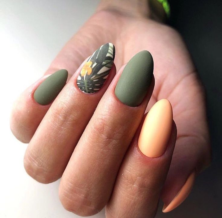 For the lovers of earthy tones and the magic hour of sunsets, this nail art incorporates shades of olive and peach, harmoniously blended with floral decals. This design is a subtle nod to the designs 2024 trend, where colors and art meet the sophistication suitable for an almond or square nail shape, making it versatile for any vacation setting.