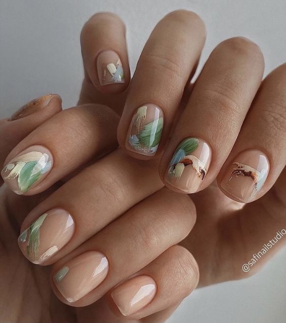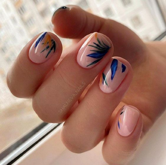 Embrace the calming effect of seaside flora with these cute and simple nails that feature hand-painted leaves and blooms. This design is a serene interpretation of designs ocean, where the transparent overlay acts as the clear waters, and the greenery represents the life beneath. It’s a vacation simple gel short design that’s understated yet undeniably chic.