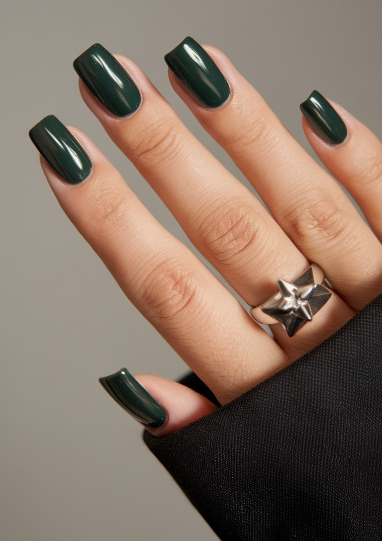 A deep green polish creates a timeless and classy look, ideal for those who want a refined yet unique style. This solid color is bold but not overpowering, making it a great match for both dark and pastel gown choices. The glossy finish enhances the richness of the shade, adding a luxurious touch to your graduation day look. This is a perfect example of how to choose the perfect shade that balances elegance and individuality.