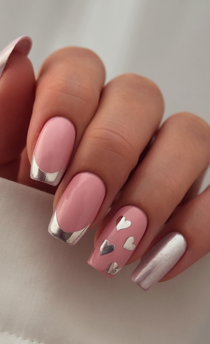 This fresh take on a French manicure features soft pink polish with metallic silver tips. A touch of decoration is added with delicate silver heart embellishments, creating a playful and feminine design. The mix of glossy and chrome finishes makes this a unique pictorial choice for graduates who love a bit of sparkle. A cute and stylish option that pairs well with any gown color.
