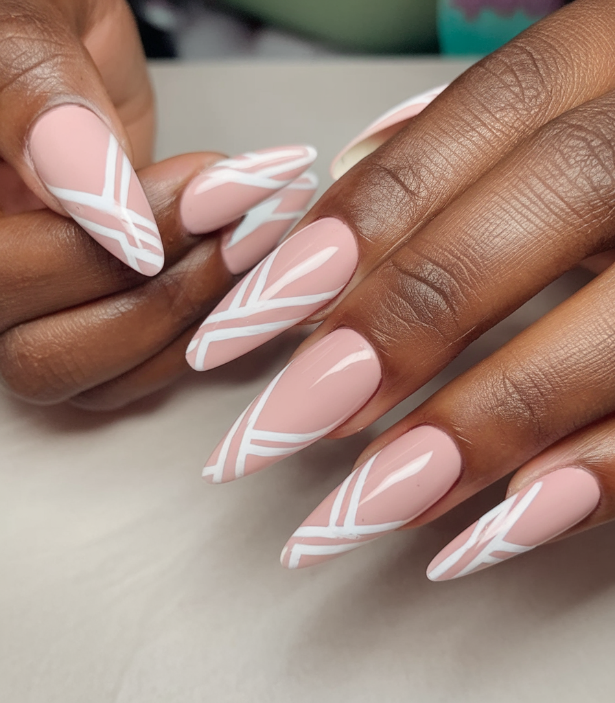 This extension designs nude style features a soft pastel pink base with sleek white geometric lines for a crisp, modern effect. The long almond shape enhances the elegance of this look, making it a versatile choice. This design balances simplicity with intricate detail, making it one of the most stylish graduation nail color ideas 2025. A perfect mix of minimalism and creativity for a contemporary graduation look.
