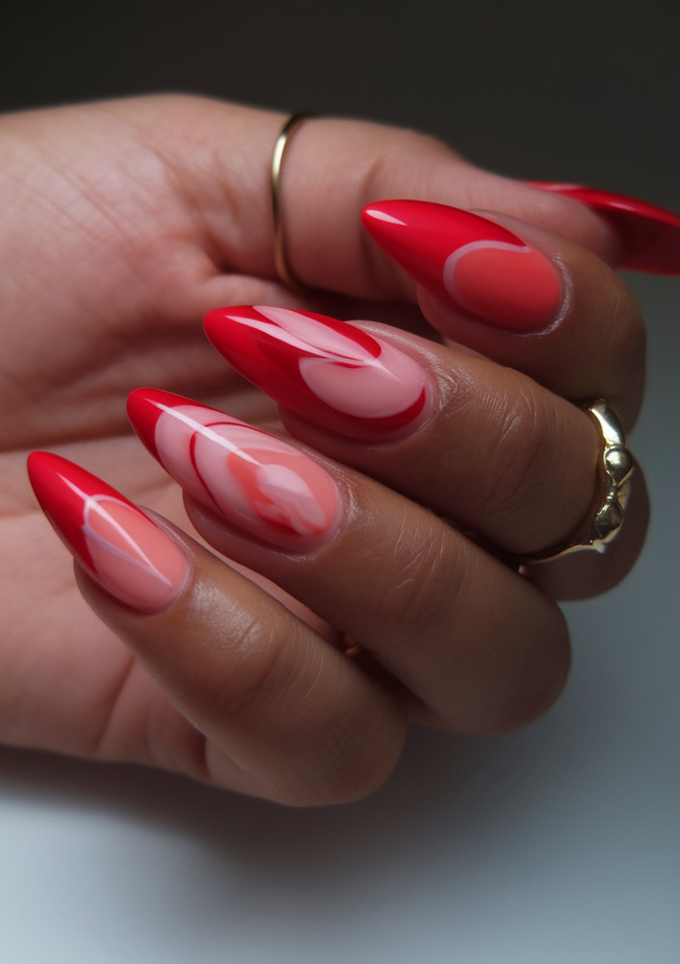 This vibrant colorful nail design features bold red and pink swirls in a dynamic, fluid pattern. The glossy polish enhances the contrast between the shades, giving the nails an eye-catching, artistic appeal. This look is perfect for those wanting a standout manicure that pairs well with a bold gown choice. A confident and energetic idea for a graduation day statement.