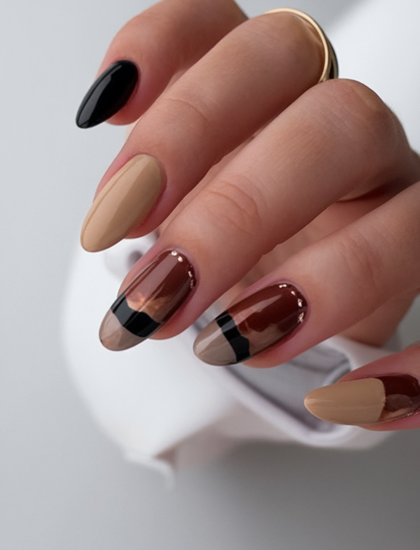 This pictorial nail design combines nude and brown tones with bold black geometric accents for a modern and sophisticated look. The combination of glossy and matte polish finishes adds depth, creating a stylish and refined contrast. This elegant scheme works well for those who prefer understated yet chic graduation nail color ideas 2025. A subtle but fashionable idea that enhances any outfit.