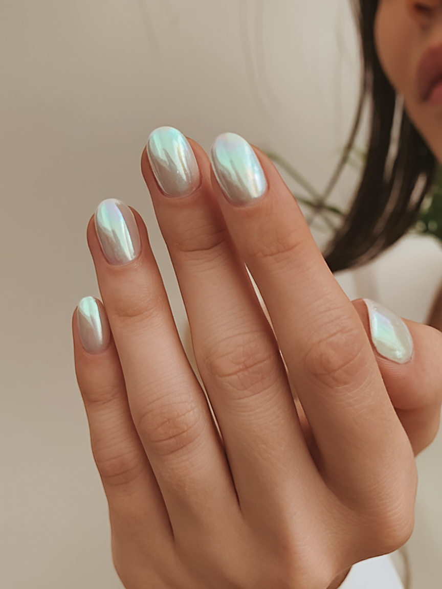A shimmering, pearlescent chrome polish gives these short, rounded nails a futuristic and ethereal touch. The reflective effect shifts between soft pastels and metallic hues, making it a versatile choice for any gown color. This extension designs nude option is ideal for those who want a minimal yet mesmerizing look. A dreamy idea for a stylish and modern graduation manicure.