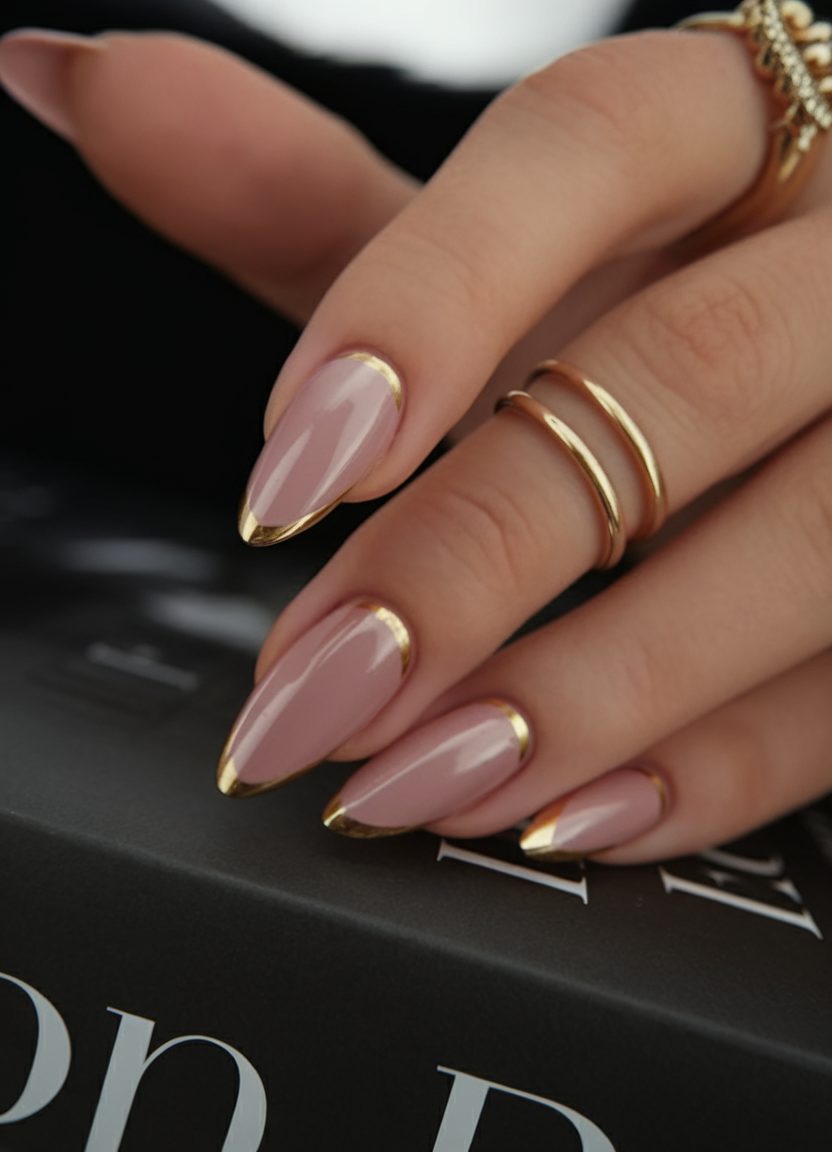 This chic extension designs nude look features a soft pink polish with precise gold stripe accents along the tips. The pointed almond shape adds refinement, while the metallic detailing enhances the minimalist aesthetic. This idea works well for those who prefer a clean, stylish, and versatile design that pairs seamlessly with any gown. A timeless and graceful choice for a polished graduation look.