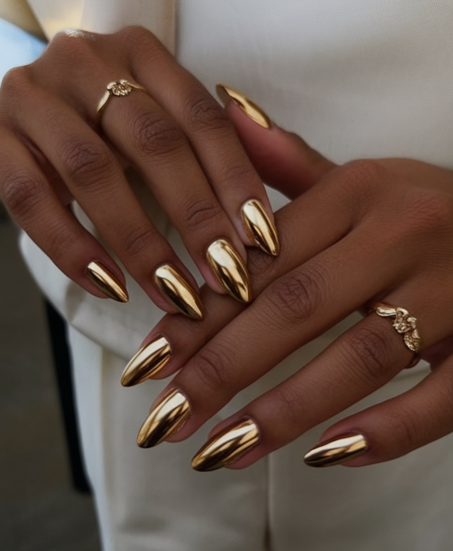 This high-shine gold polish creates a bold, mirror-like effect, giving the nails a luxurious and striking appearance. The almond shape enhances the elegance, making it a standout idea for those who love statement manicures. This design pairs beautifully with neutral or dark gown shades, offering a regal and polished finish. A sleek and futuristic scheme perfect for graduation day.