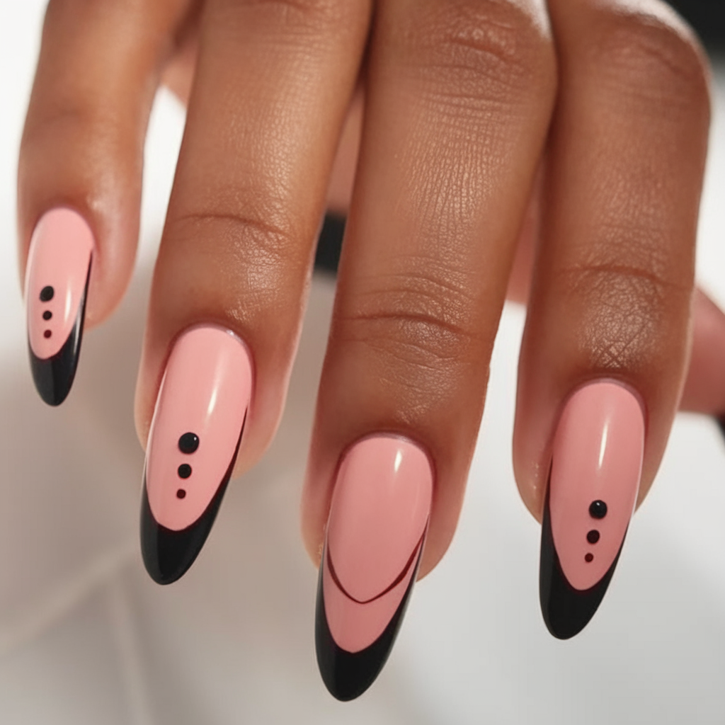 This modern take on the French manicure features a soft pastel pink base with deep black tips. The pointed almond shape enhances the sleekness of the design, while delicate dot decoration adds a unique touch. This polish combination creates a sophisticated yet edgy look, making it a versatile option for both classic and bold gown choices. A stylish idea for those who love contrast and elegance.