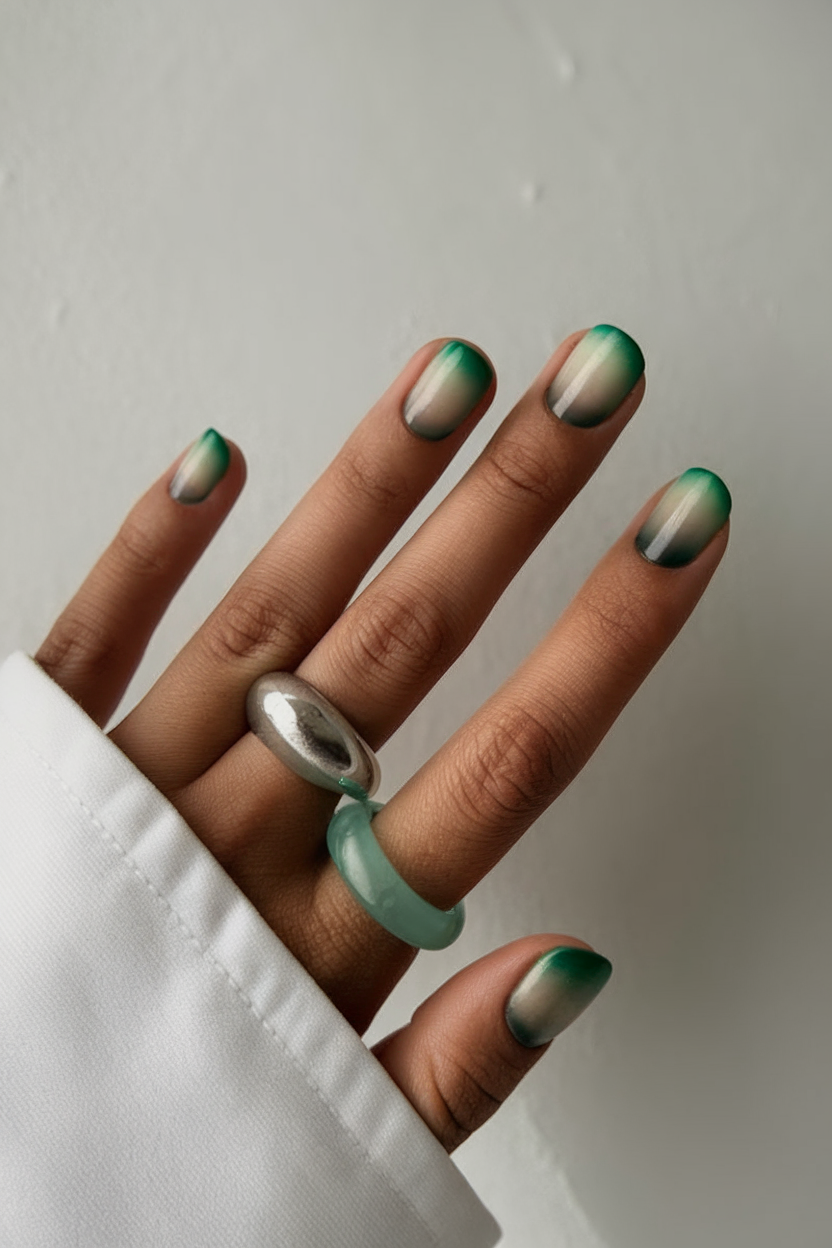 This modern extension designs nude manicure features a subtle ombre effect that fades from a neutral base to a deep green tip. The matte polish finish enhances the gradient, giving it a soft and effortless elegance. The short, rounded shape keeps the look fresh and contemporary, making it a stylish idea for those who love earthy tones. A perfect scheme for a minimalist yet unique graduation look.
