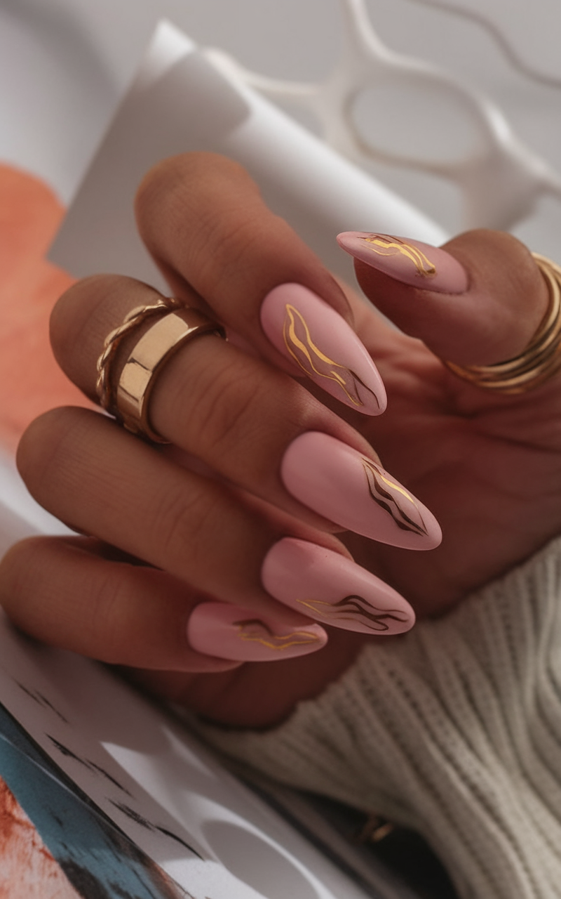A pastel pink base with fluid gold foil accents creates an elegant and artistic manicure. The almond shape enhances the graceful design, while the metallic decoration adds a touch of glamour. This pictorial nail art balances subtlety and luxury, making it a versatile idea that complements both simple and sophisticated gown choices. A stylish yet timeless option for graduation day.