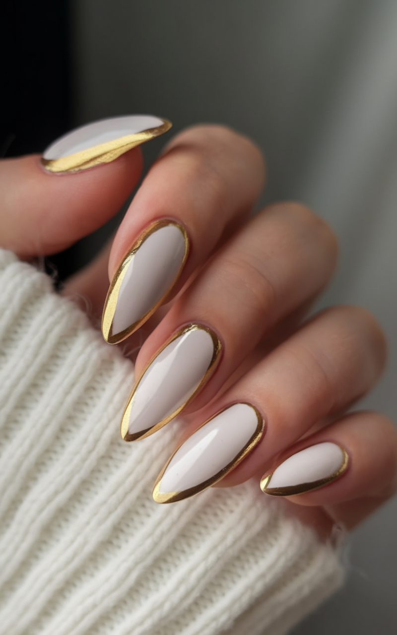 This striking polish design features a glossy white base framed with a delicate gold edge, creating a bold yet refined effect. The sharp almond shape adds a modern twist, while the metallic detail enhances the overall elegance. This scheme works beautifully for those who love classic styles with a luxurious upgrade. A sophisticated idea that pairs well with both neutral and colorful gown options.