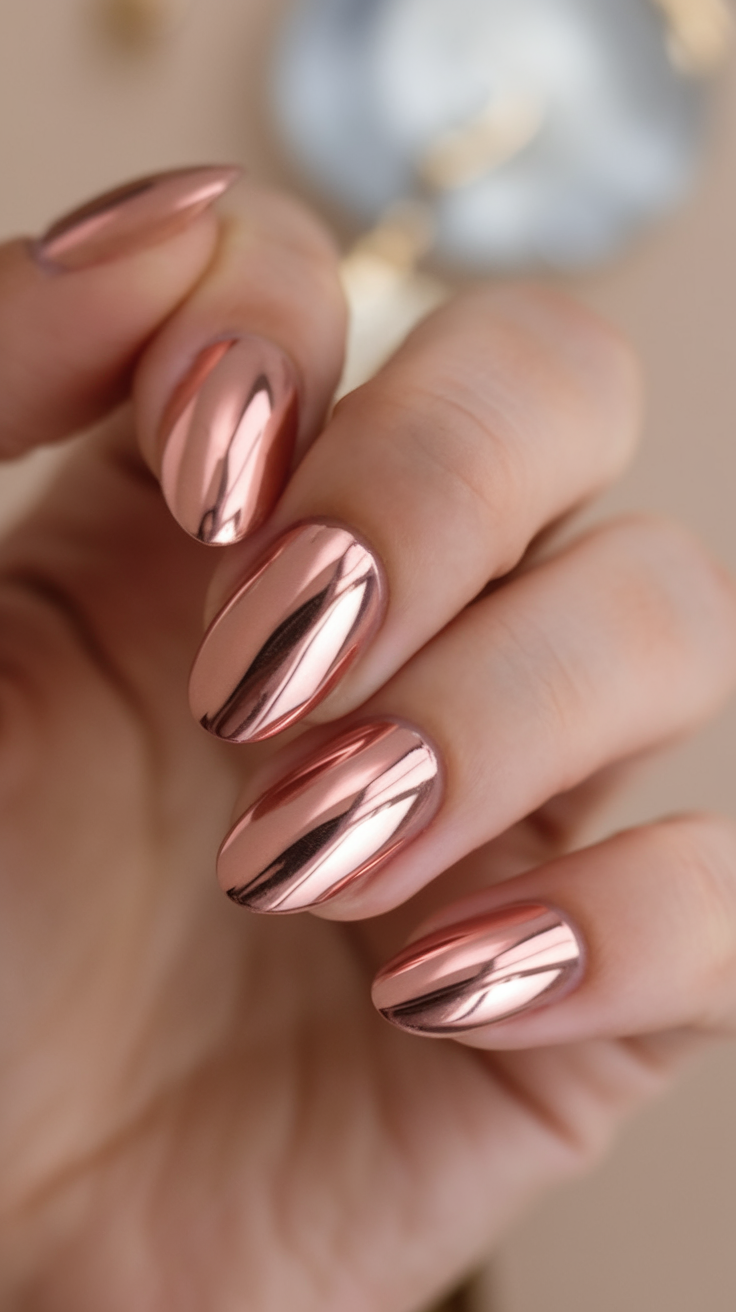 This striking colorful rose gold chrome manicure is a bold statement that shines under any light. The mirrored polish effect gives a futuristic and high-fashion feel, perfect for those looking for dazzling decoration on their graduation day. The reflective finish pairs well with both neutral and bold gown colors, offering a luxurious and stylish idea. A perfect way to choose the perfect graduation nail look with a glamorous edge.