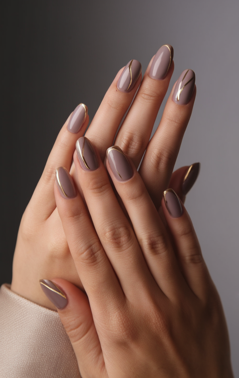A muted taupe polish elevated with thin gold lines creates a sophisticated and modern look. The sleek extension designs nude effect is both minimal and stylish, offering a versatile option for any gown choice. The fine metallic decoration adds just the right amount of detail without being overpowering. This is a great idea for those who prefer understated elegance with a hint of glamour.
