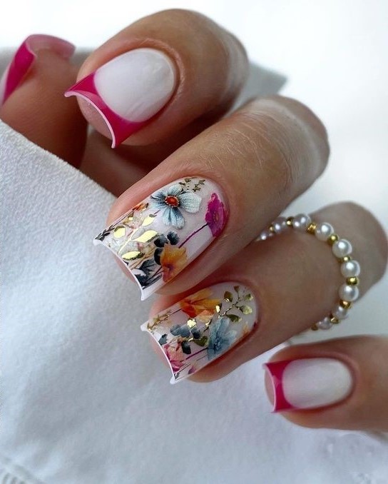 Imagine a classic French tip, but with a garden blooming right at your fingertips. That’s the essence of this modern twist on the French manicure. The delicate floral patterns, set against a transparent base, blend seamlessly with the iconic pink and white tips. The design whispers of natural beauty with an understated elegance, making it perfect for a simple pretty look that speaks volumes. It’s a fresh take that will suit any short or long nail preference and is just right for a sunny day out or a sophisticated evening event.