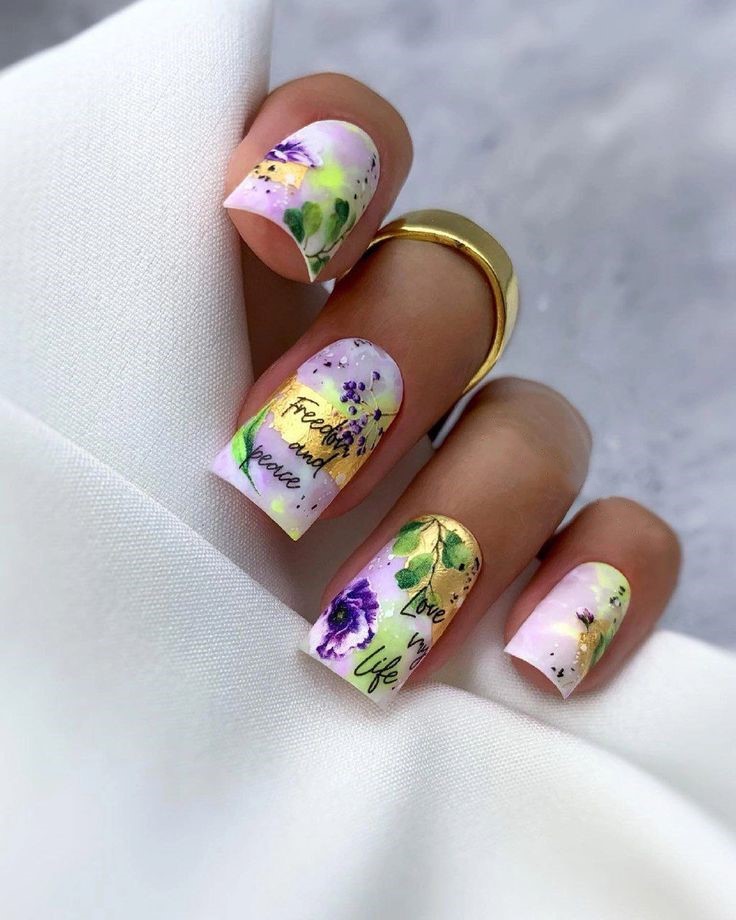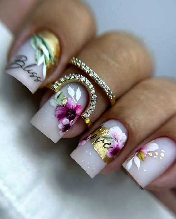 Ending on a note of pure sophistication, this manicure pairs soft florals with inspiring messages like “Bliss” and “Hope,” accented with gold flakes that capture the light and the eye. It’s a gel natural look that combines the simple pretty with a touch of glitter french, making it versatile for both ideas for short nails and long. This design speaks to the heart, perfect for the woman who values positivity and elegance in every aspect of her life.