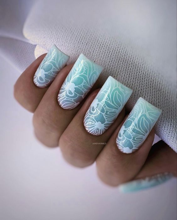 Dive into the cool serenity of aquatic floral designs with these nails that marry the tranquility of the ocean with the grace of floral motifs. The soft teal hues are reminiscent of gentle waves, while the white floral patterns add a touch of elegance, making this a perfect shellac choice for those long summer days. Whether you’re attending a beachside wedding or sipping cocktails by the pool, these nails are a breath of fresh beach hawaii tropical air.