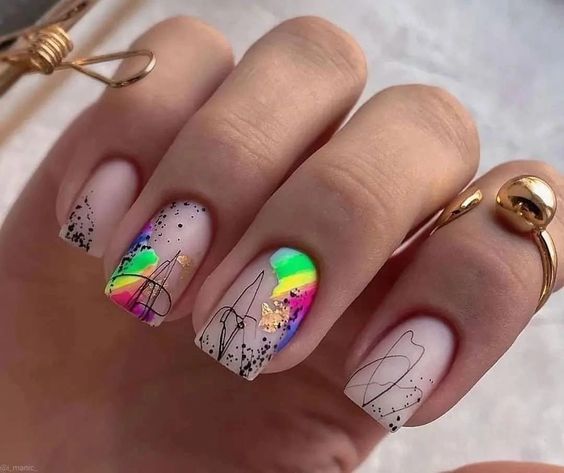 For the woman who loves to stand out, this neon abstract design with geometric shapes is the ultimate summer statement. The burst of neon colors against a translucent base is reminiscent of a summer rave or a vibrant street festival. It’s a designs short nail favorite that can easily adapt to longer lengths, perfect for the daring fashionista ready to embrace the season’s brightest trends.