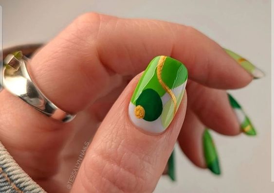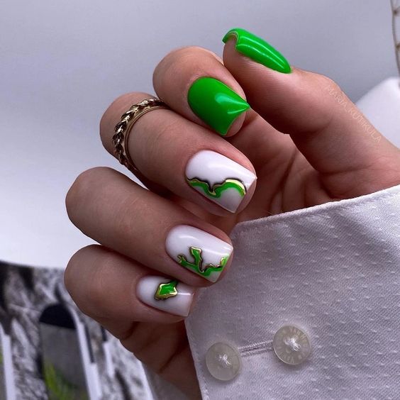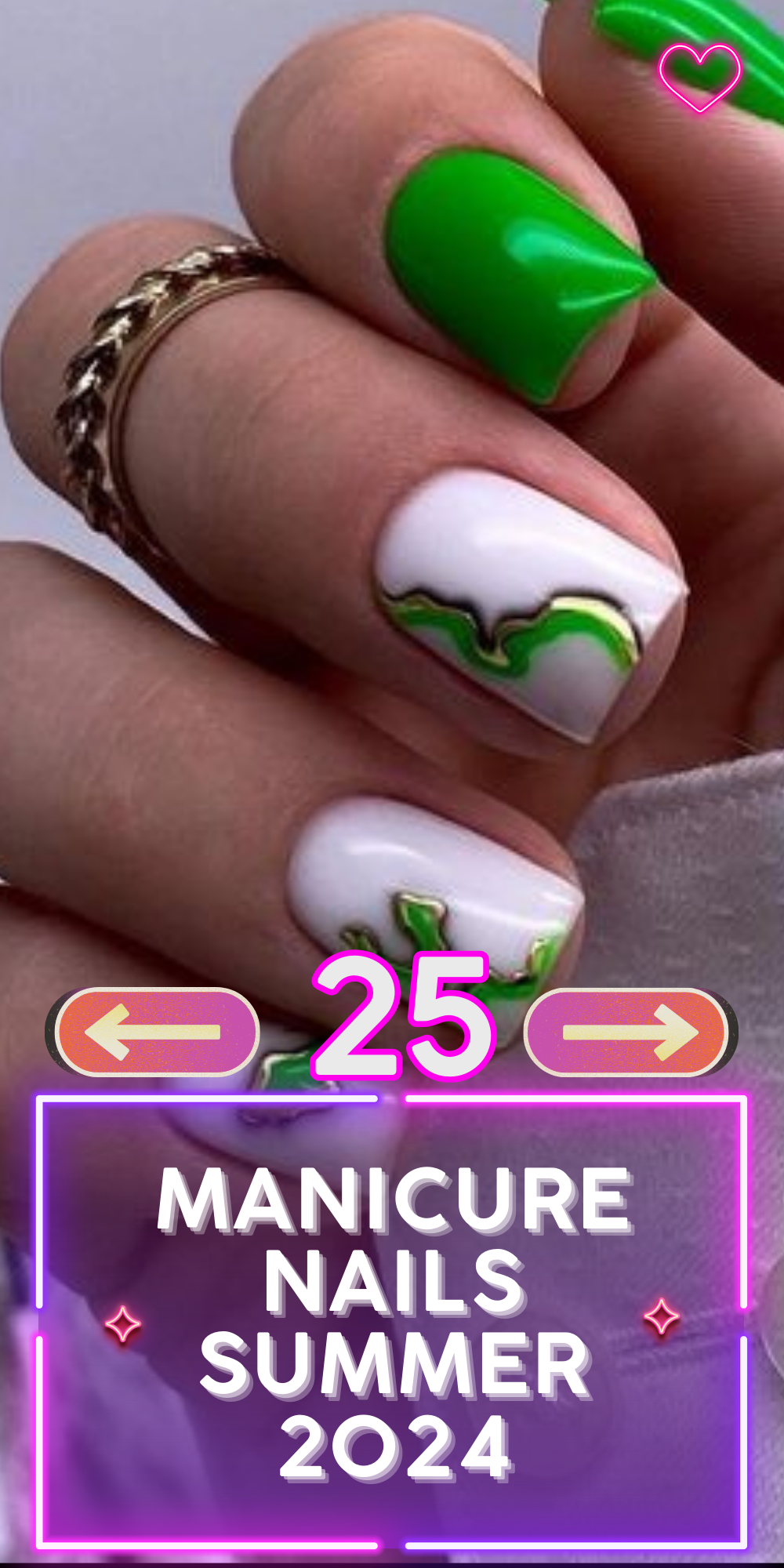 Summer is a time of vitality, and what better way to express this energy than with a vivid green manicure? This look combines striking green accents with a clean white base, embodying the spirit of minimalist design with a punch of exuberance. These nails are perfect for those who appreciate a pop of color while maintaining an air of simple pretty elegance.