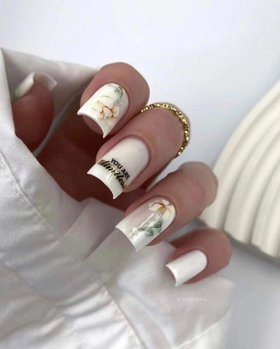 The elegance of white combined with the opulence of gold creates a manicure that’s sophisticated and luxurious. This botanical-inspired nail art, with its delicate white leaves and golden highlights, offers a natural and minimalist look. It’s a versatile style that pairs beautifully with a french manicure base, adding just the right amount of glitter french to catch the sunlight and dazzle onlookers.