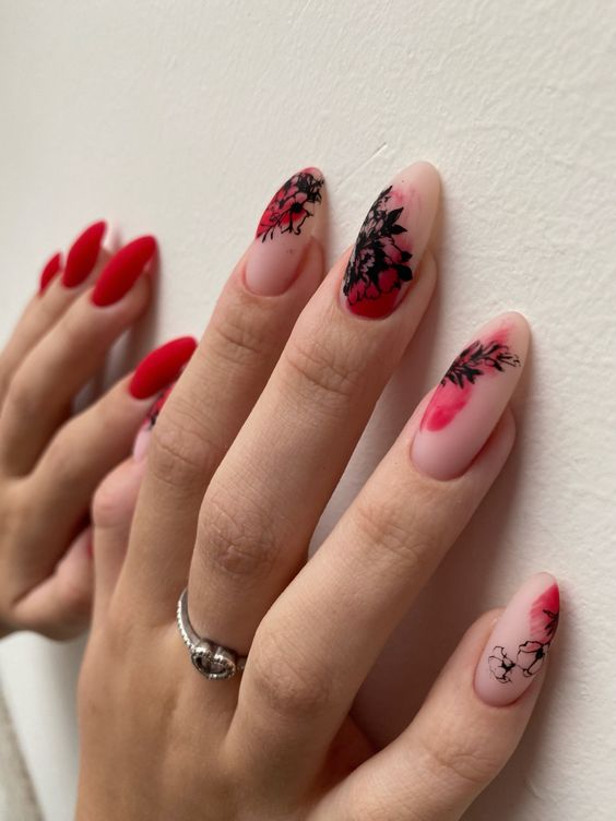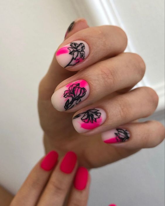 Next, we venture into a bolder territory with an ombre french design that fades from a passionate pink to a daring black. This manicure exudes confidence and is sure to turn heads. It’s an ideas short and ideas long nails amalgamation that fits the bill for those who wish to make a statement without saying a word. The black floral accents are a nod to the designs french trend that has been beloved for years, adding a touch of drama to the otherwise soft gradient.