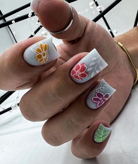 This design is a delightful medley of floral accents, each nail featuring a different bloom. Set against a crisp white background, the colorful flowers pop, making a statement of natural beauty and grace. It’s a simple pretty approach to summer nails, with each petal and leaf meticulously painted to create a miniature garden at your fingertips. The minimalist design provides a fresh and clean look, yet each colored detail adds a touch of vibrancy, perfect for any summer outfit.
