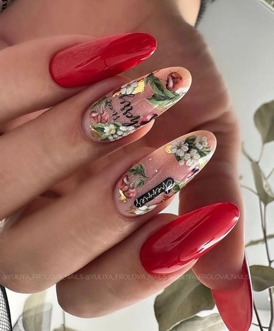 Introducing a true celebration of summer’s floral bounty, this design is a romantic interplay of vibrant reds and delicate floral art. The glossy red base on some nails provides a classic, timeless look, while the intricate flower and leaf patterns on the others offer a natural and minimalist touch.