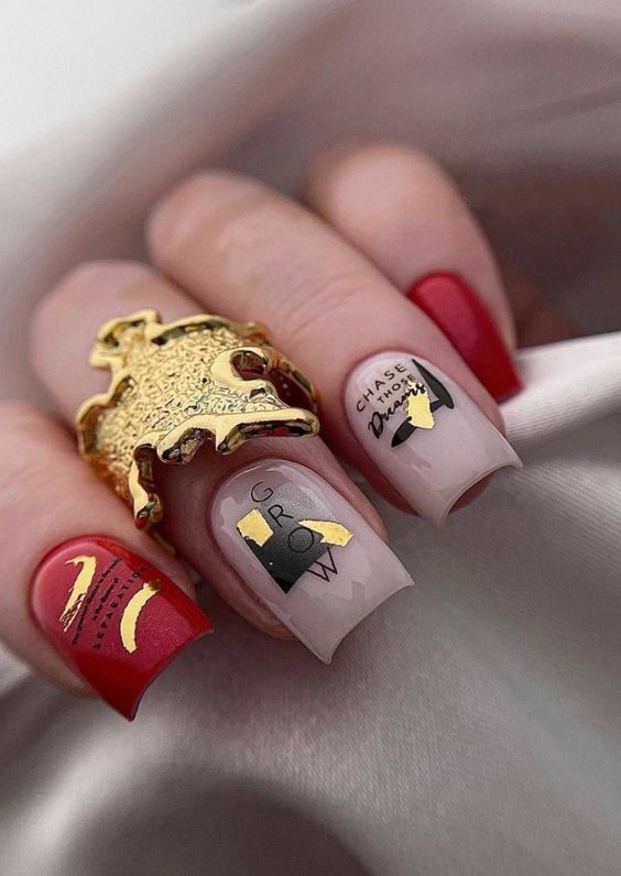 For those who view their nails as a canvas for artistic expression, this red and beige combination is a masterpiece. The deep red accents evoke a sense of boldness, perfect for the woman who’s not afraid to chase her dreams – quite literally, as the design includes the inspiring words “Chase Your Dreams.” The gold foil adds a hint of luxury, aligning with the gel natural and glitter french trends for those who love a bit of sparkle. It’s a designs for short and long nails that captures the essence of ambition with style.