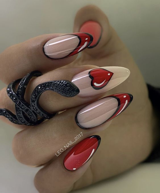 Sleek and undeniably chic, this next design takes the french tips glitter to a whole new level. The red cut-outs on a nude base are the epitome of minimalist design, offering a modern twist on the classic French tip. Perfect for those who prefer ideas for short nails but still want to make a bold statement, this manicure is a testament to the saying that less is indeed more. Pair it with your favorite ring, and you’re ready for any high-fashion event or a romantic dinner by the beach.