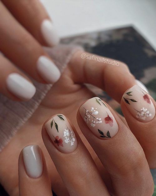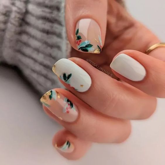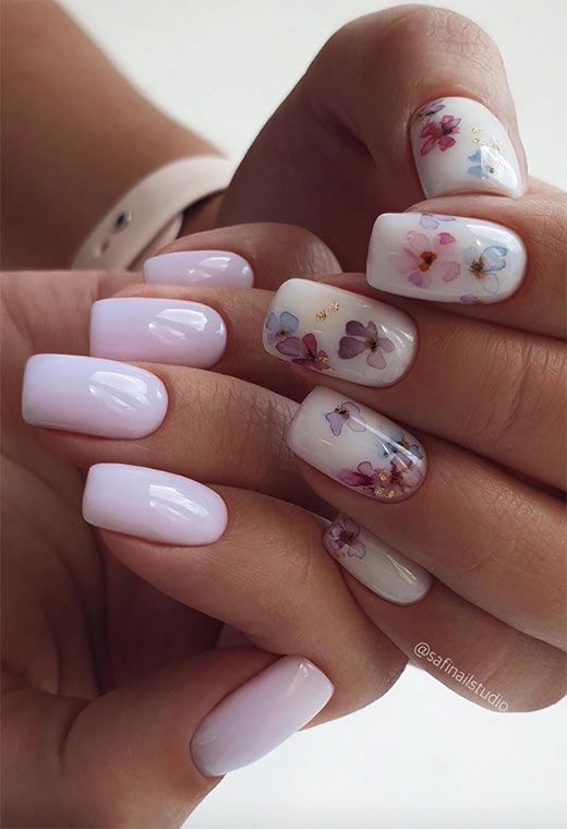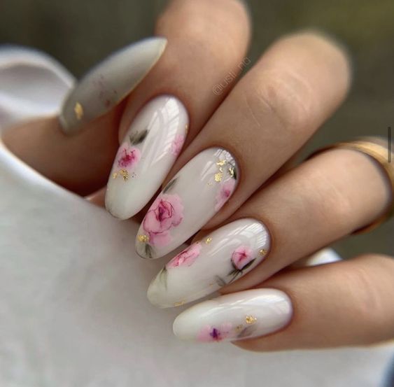 Lastly, these gel nails exude freshness with their clean white base, adorned with delicate floral patterns and gold foil accents. It’s a spring look that’s both refreshing and elegant, capturing the joy and new beginnings the season represents.