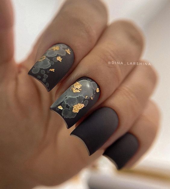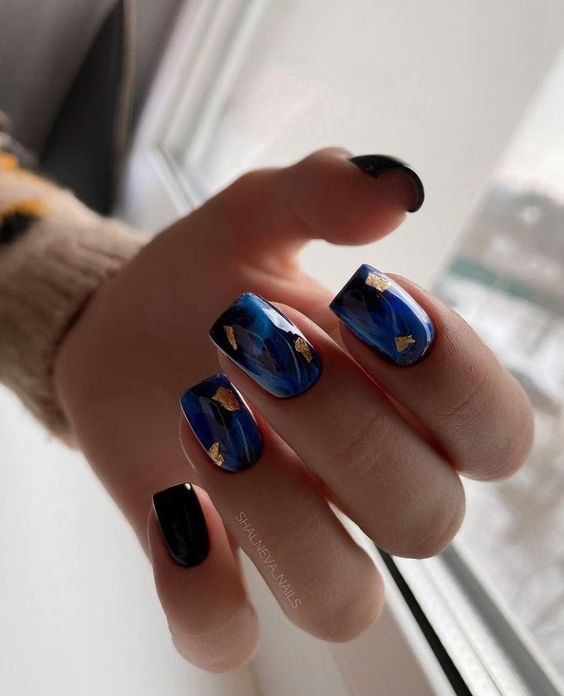 Celebrating the luck of the Irish, these short nails feature a deep blue base with playful specks of St. Patrick’s day pot of gold. The scattered golden flakes add a touch of whimsy and prosperity, perfect for making a festive statement.