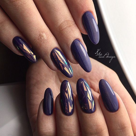 These almond acrylic nails are a nod to the cosmos, featuring a rich purple base with eye-catching holographic details that capture the light and the imagination. It’s a design that marries spring’s awakening with the mystery of the stars.
