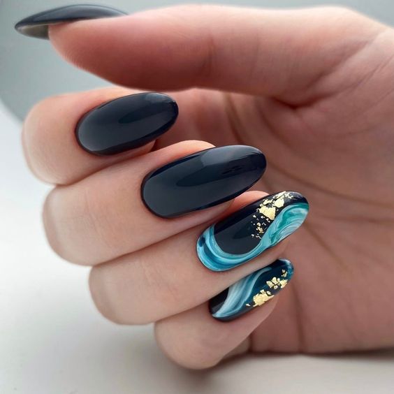 Dive into the depths of imagination with these acrylic almond nails, featuring deep blue tones swirled with aquamarine and speckled with gold. They evoke the enchanting beauty of oceanic waters and starry nights.