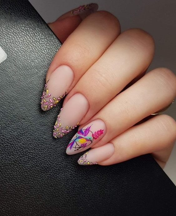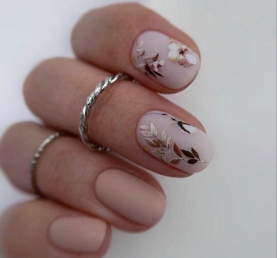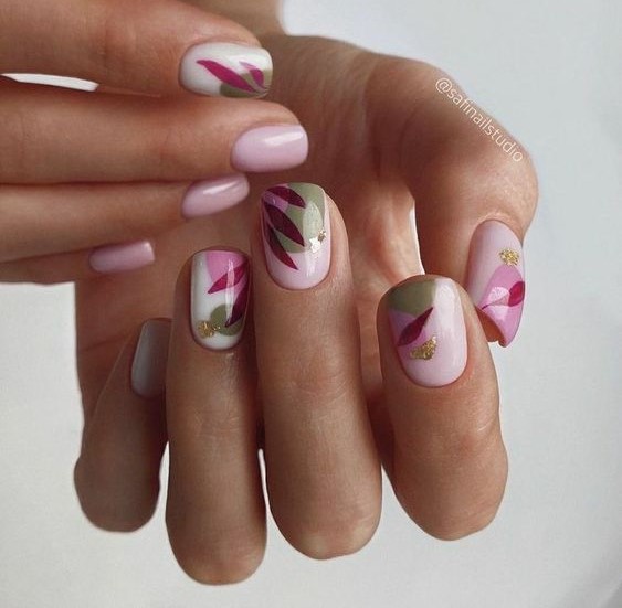 The gel nails here are reminiscent of a serene spring garden, with their soft pink hue and delicate floral designs. Golden accents add a touch of sophistication, making them perfect for a natural yet refined look.