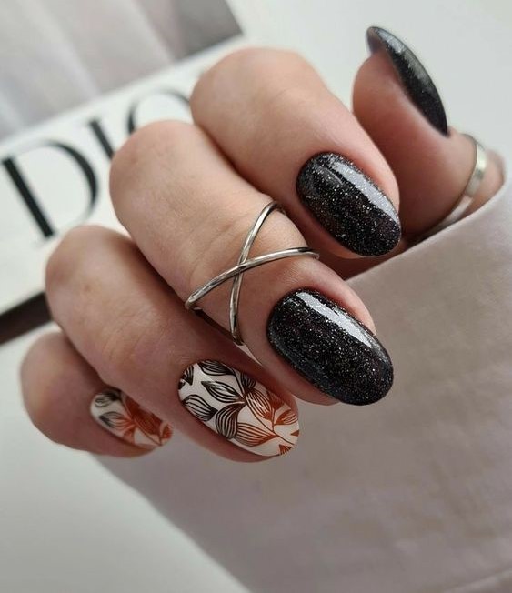 Transitioning from the bright greens of St. Patrick’s to the deeper tones of the coming seasons, these acrylic coffin nails are bold with their glittering black polish. A touch of autumn is brought in with the contrasting nail featuring a warm, leafy design, perfect for those who are already anticipating the next turn of the season’s wheel.