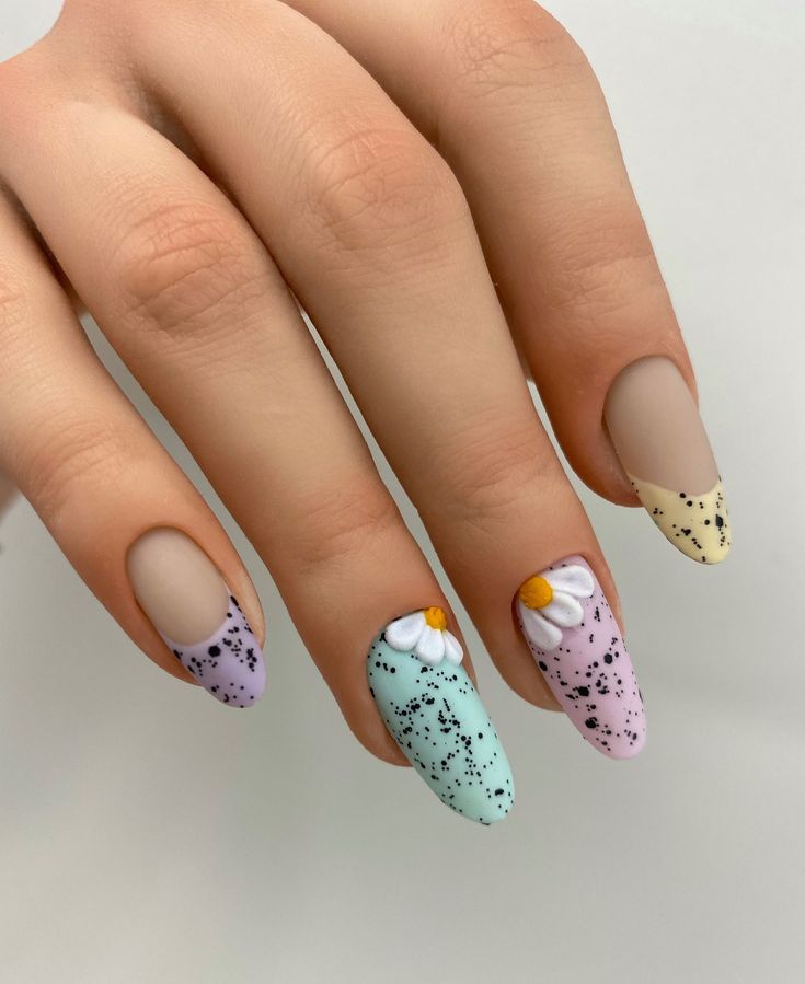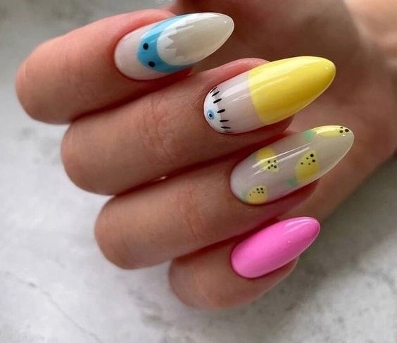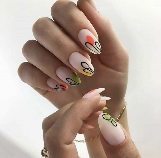 Nothing says summer like the fresh splash of citrus, and these nails capture that essence. A matte finish in pastel pink, yellow, and green is accented with a sprinkle of black speckles, giving the impression of a sun-kissed fruit. The almond shape keeps the look fresh and fun, perfect for a summer picnic or a stroll through a weekend farmers’ market.