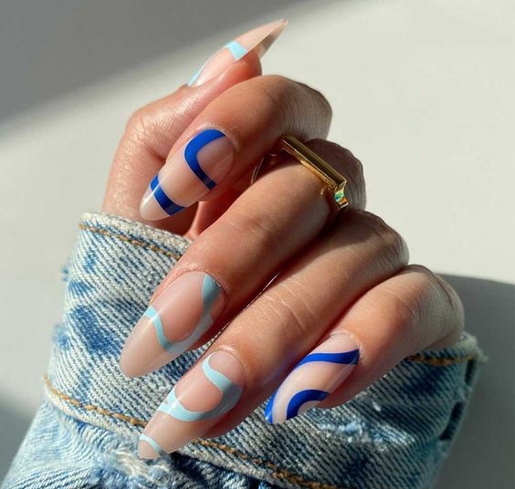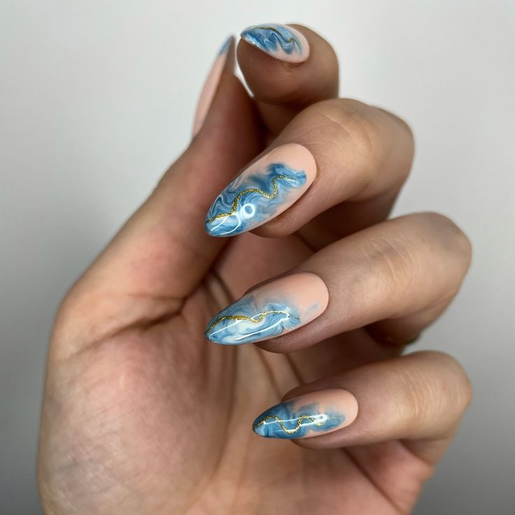 For the woman who carries the essence of the ocean with her, this marbled acrylic design in shades of blue and white, with a kiss of gold, is reminiscent of the Mediterranean Sea. Each nail is a unique masterpiece, resembling the gentle lapping of waves against the shore, perfect for making a statement without saying a word. This look is ideal for those long summer days that transition into balmy evenings.