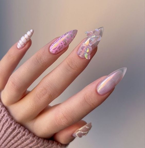 This whimsical design is a pastel lover’s dream, blending soft hues with playful textures. One nail is adorned with a French tip in white, reminiscent of a chic candy cane. The adjacent nails feature an iridescent pink base, with one showcasing an enchanting butterfly charm that seems to flutter off the nail. This set is perfect for those who love to add a fairy tale touch to their look, ideal for a summertime tea party or a whimsical wedding.