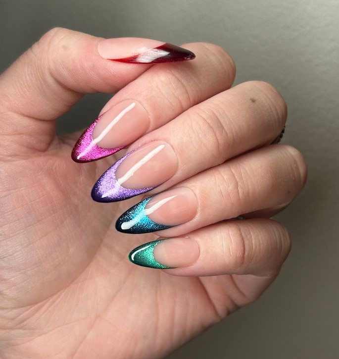 Dive into a spectrum of color with these vibrant, chromatic tips. Each nail transitions from a natural nude base to a metallic tip, with colors ranging from fiery red, to royal purple, to a deep black. The sleek almond shape adds to the allure, creating an edgy yet sophisticated effect. It’s a design that resonates with the bold at heart, those who aren’t afraid to show their true colors in a boardroom or at a beachside bonfire.