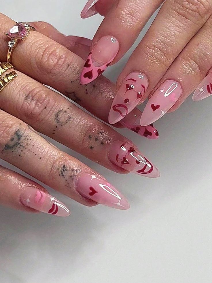 For those who wear their hearts on their… nails, this design is pure romance encapsulated. The translucent pink base serves as a canvas for a cascade of hearts in various shades of red and pink, creating a look that’s both sweet and edgy. The acrylic coffin nails are a modern canvas for these expressions of love, perfect for a birthday celebration or a date night under the stars.